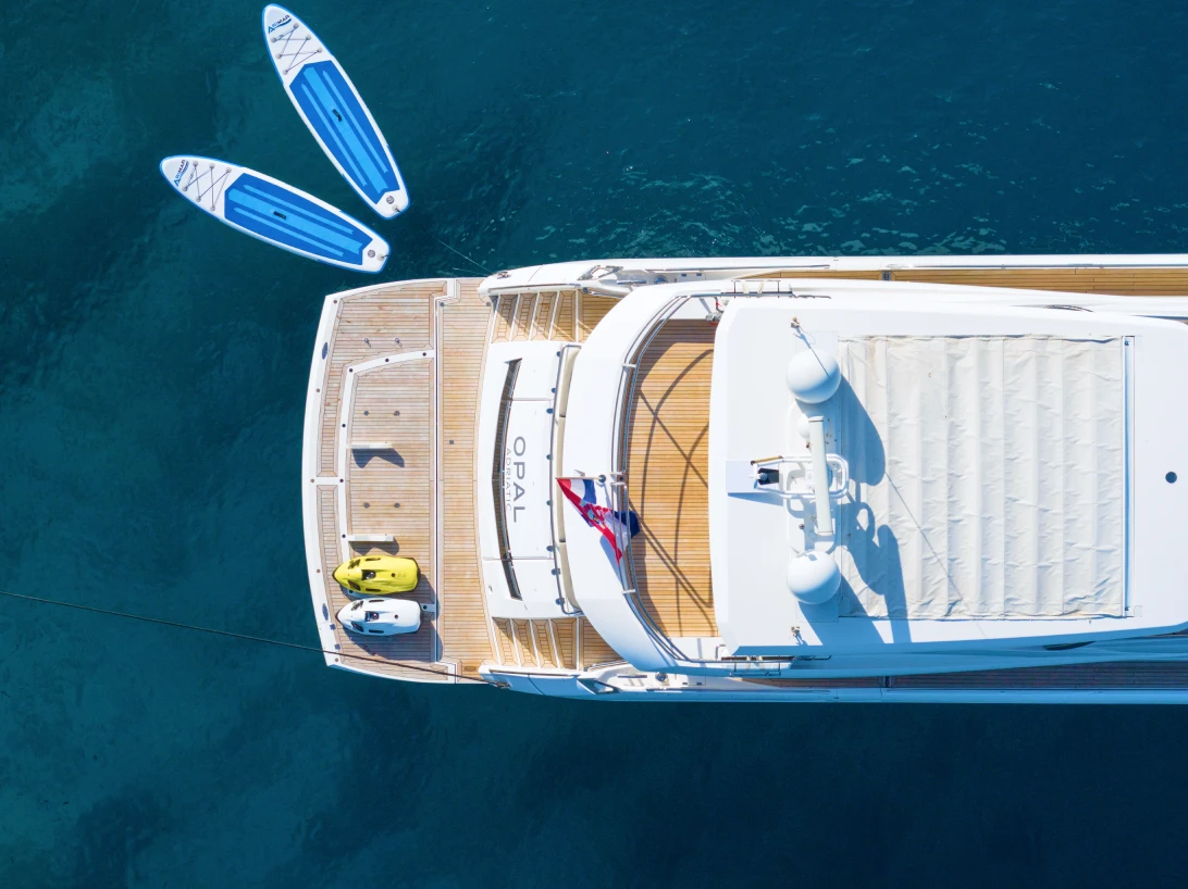 Time onboard finds a gentle rhythm: bare feet on teak, still warm towels, salt drying on skin – all while the crew keeps everything quietly in hand. You glide between coves, settling into the hush of open water, with nothing to do but stay a little longer.